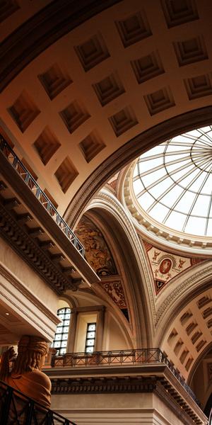 Looking up, it's easy to get lost in the patterned architecture, feeling small as it towers above.