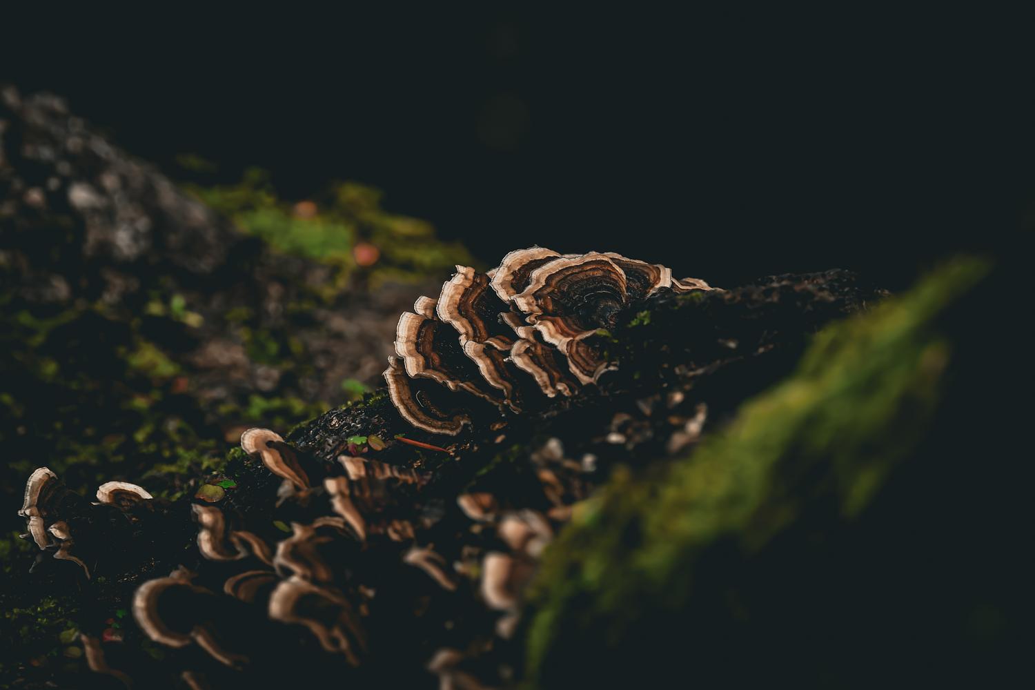 Layered Turkey Tail Mushrooms resting on mossy bark, earthy textures in low light.