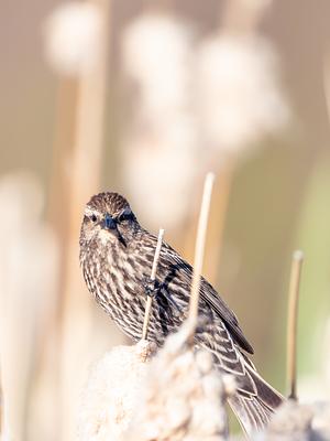 A female Red-Winged Blackbird perches quietly in the soft morning light, blending seamlessly with the golden hues of the marsh. A study in subtle strength and natural camouflage, this moment captures the quiet resilience of wetland life.